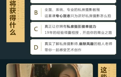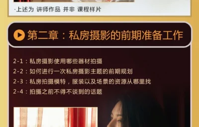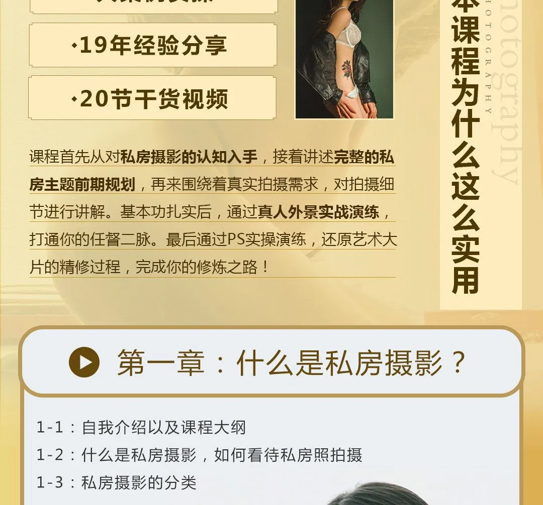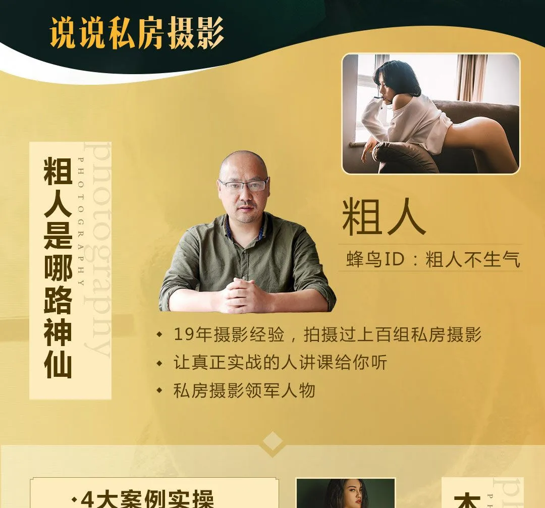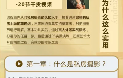 本摄影教程是关于一本正经说私房粗人私房摄影全能秘籍中文教程,时长:8小时左右,大小:9.3 GB,高清视频格式,作者:粗人,共25个章节,语言:中文。
