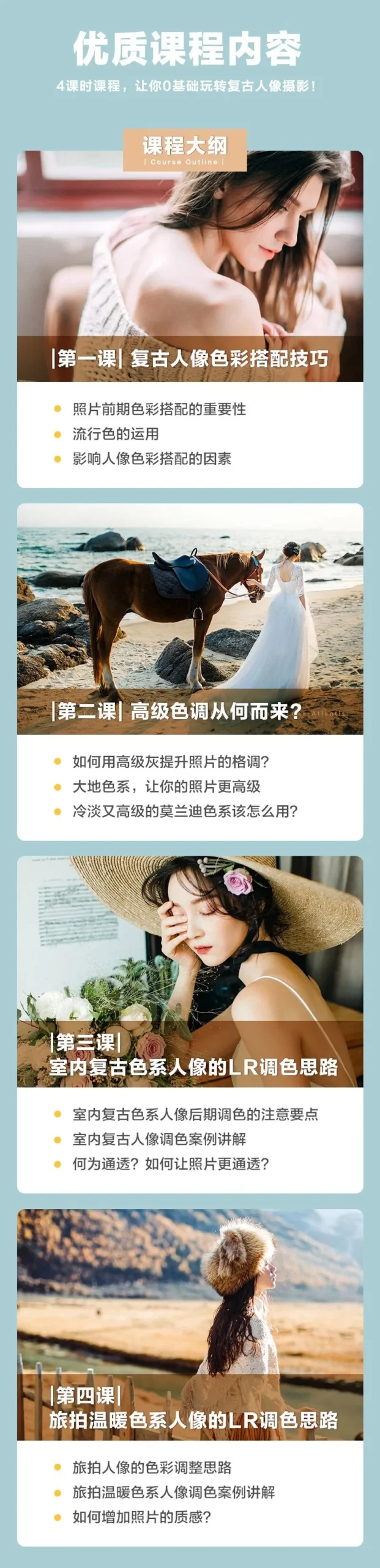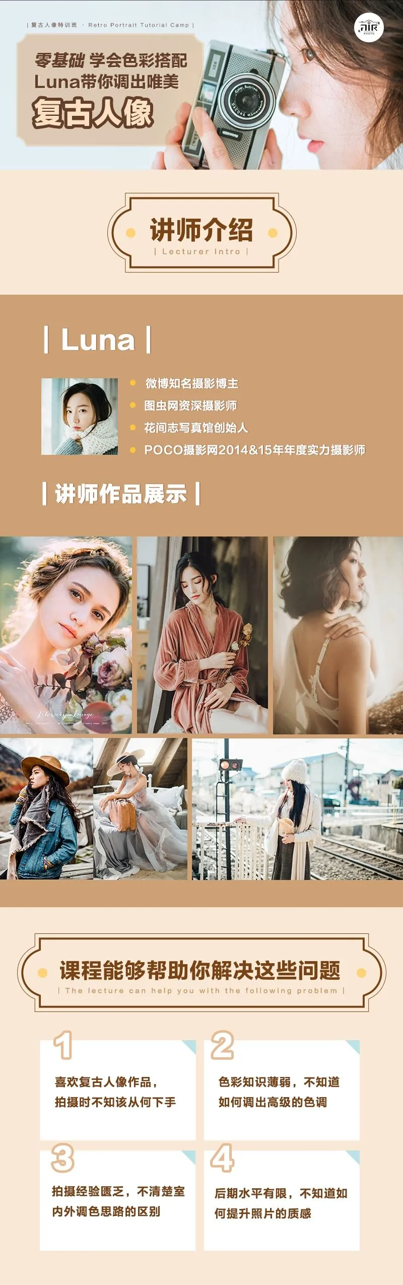 本摄影教程是关于摄影教程 零基础学会色彩搭配-Luna带你调出复古唯美人像中文教程,时长:2小时2分钟,大小:4.59 GB ,MP4高清视频格式,作者:Luna,共4章节,语言:中文。