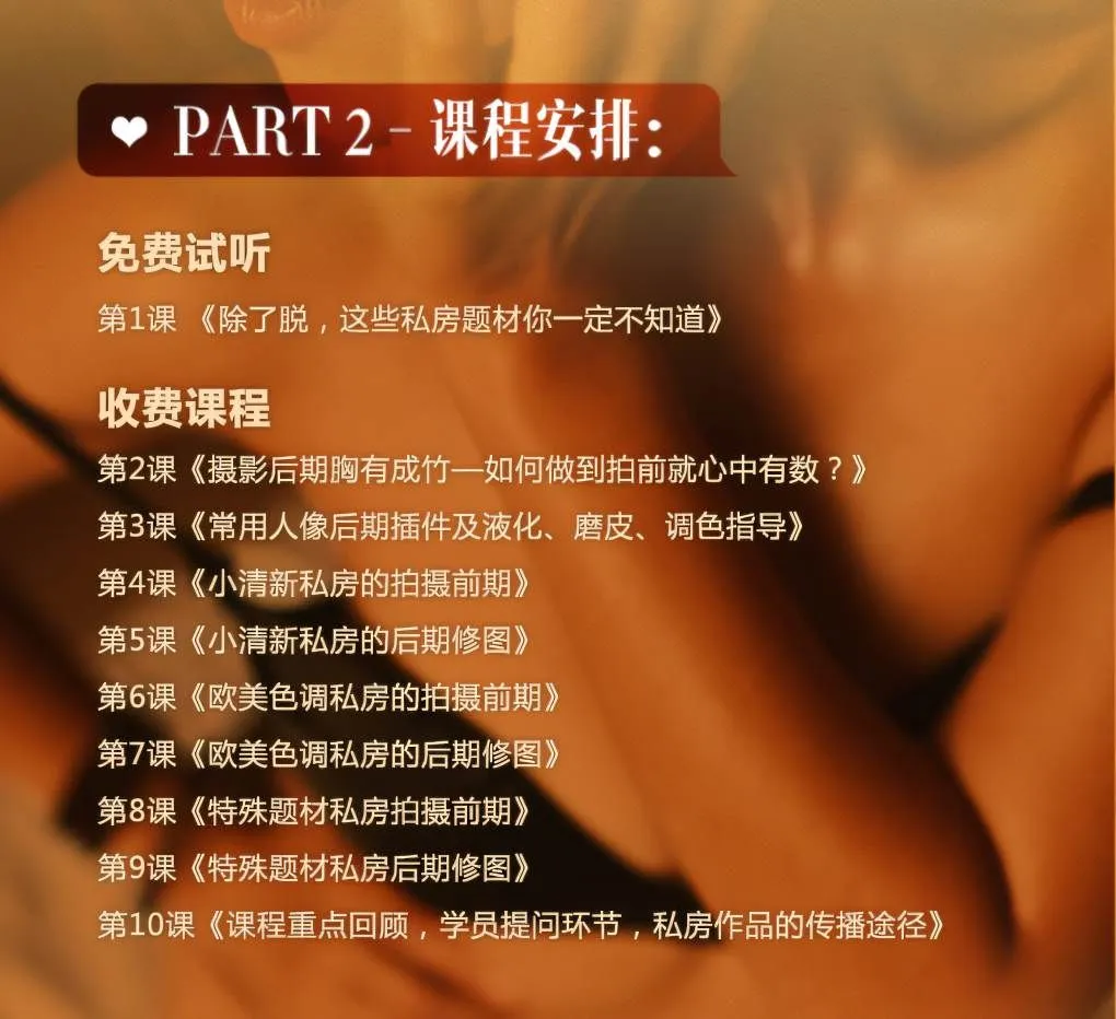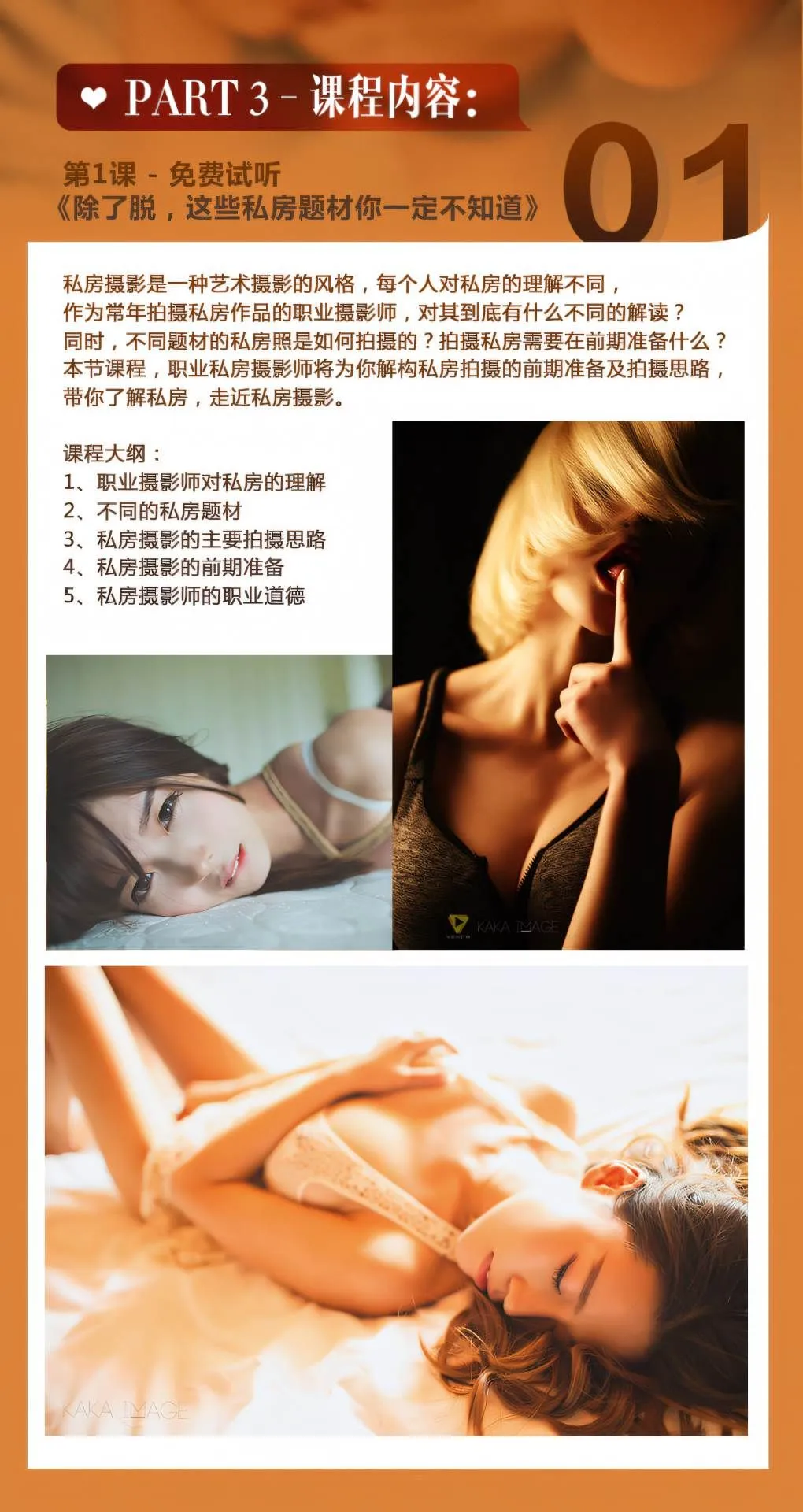 咔咔老师为摄影爱好者们带来《拒绝媚俗 10节课打造高级感私房人像》,咔咔老师将利用自己多年的私房拍摄经验,从拍摄思路、前期准备、拍摄指导再到后期修片,从基础到进阶,全方位提升大家的拍摄能力,以及对私房摄影的把控。