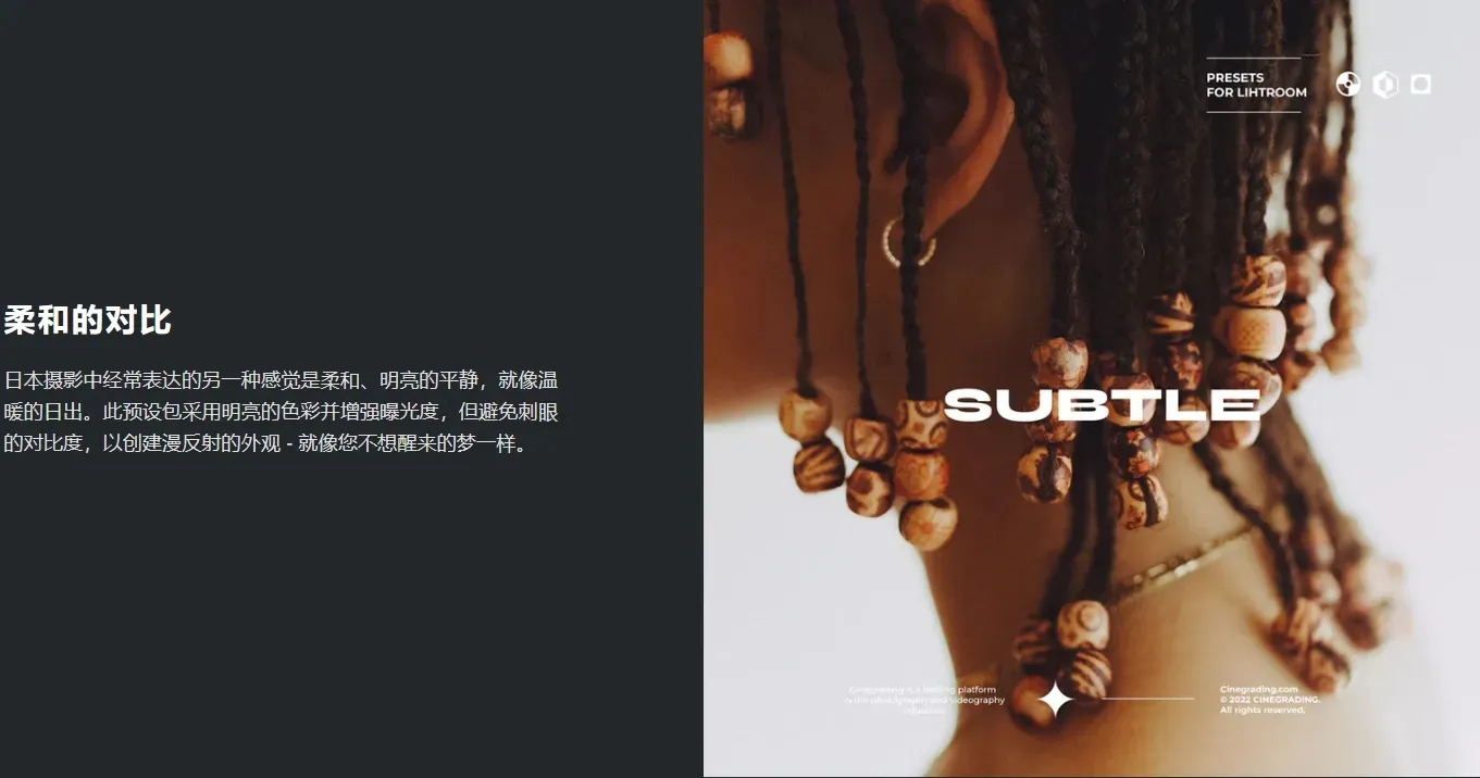 这款柔和简约的预设包灵感来自日本最具影响力的摄影师。这些预设将帮助您添加干净的色调、日本摄影风格的氛围、明亮的色彩、自然的肤色等等。