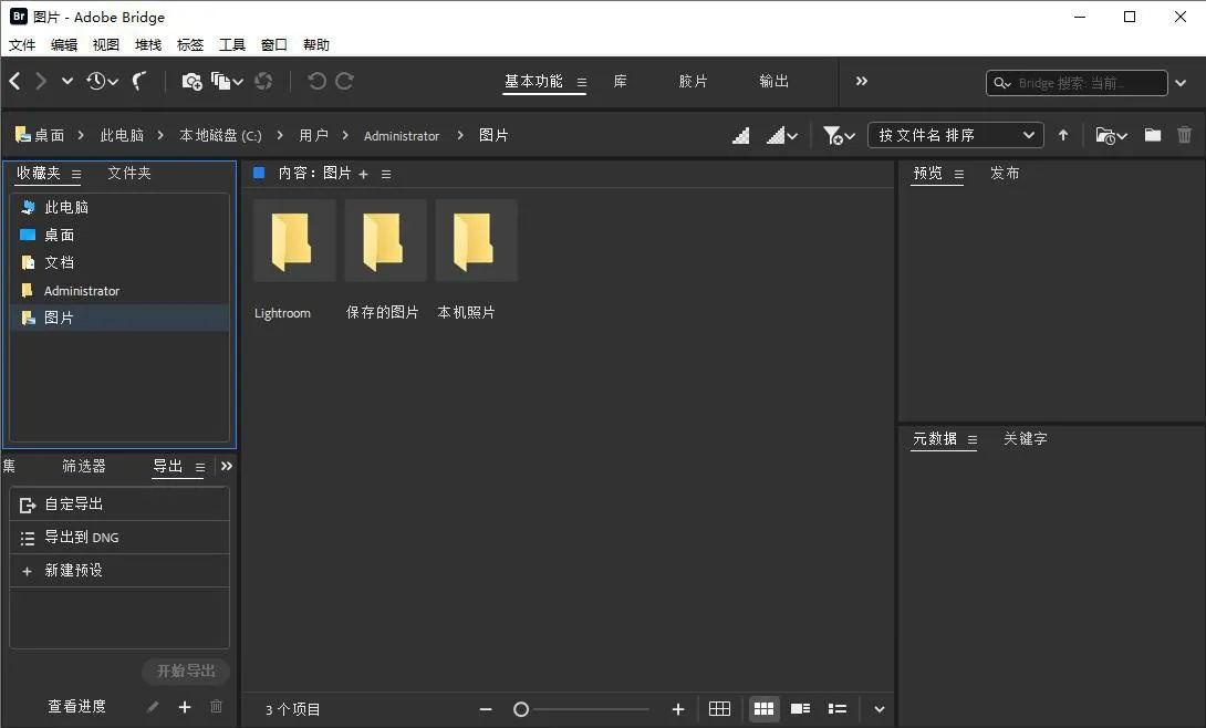 Adobe Bridge 是一款功能强大的创意资源管理器,可使您快速轻松地预览、整理、编辑和发布多个创意资源。编辑元数据。为资源添加关键字、标签和评级。使用系列来整理资源,以及使用强大的滤镜和元数据高级搜索功能来查找资源。
