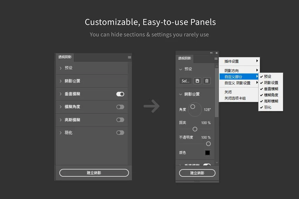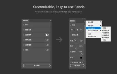 Shadowify 2是一个具有6个单个面板的插件的真正动力源,精心组装,以最佳方式简化特定用例。所有这些都附带了额外的自定义选项,使界面适合您的个人工作流程和偏好。当然,您也可以将您最喜欢的设置保存为预设,以便以后使用。