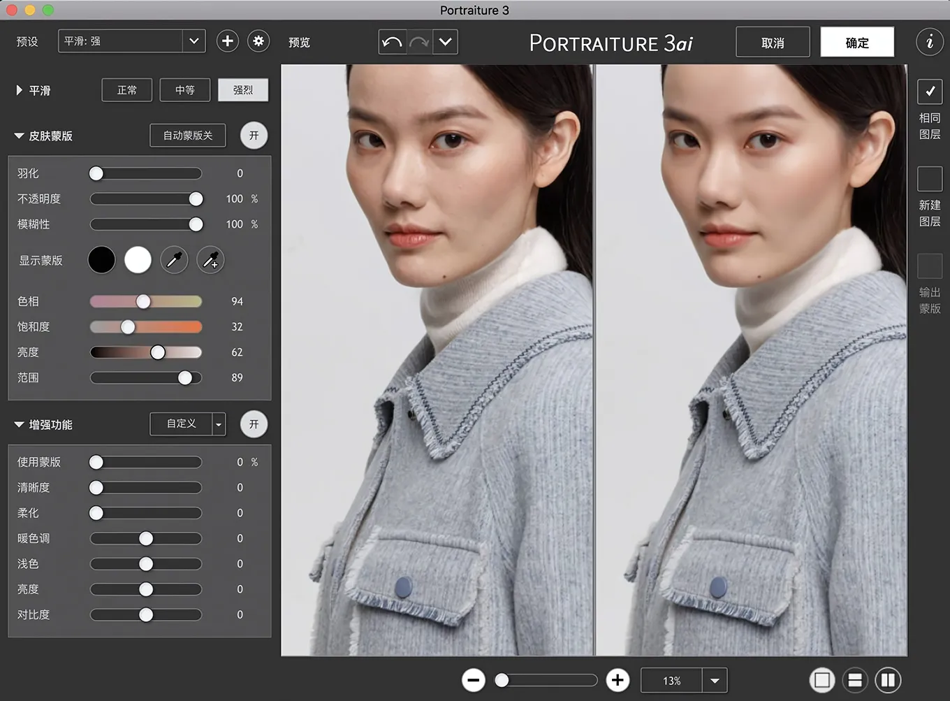 Portraiture具有强大的蒙板工具,仅在图像的肤色区域中进行选择性平滑。