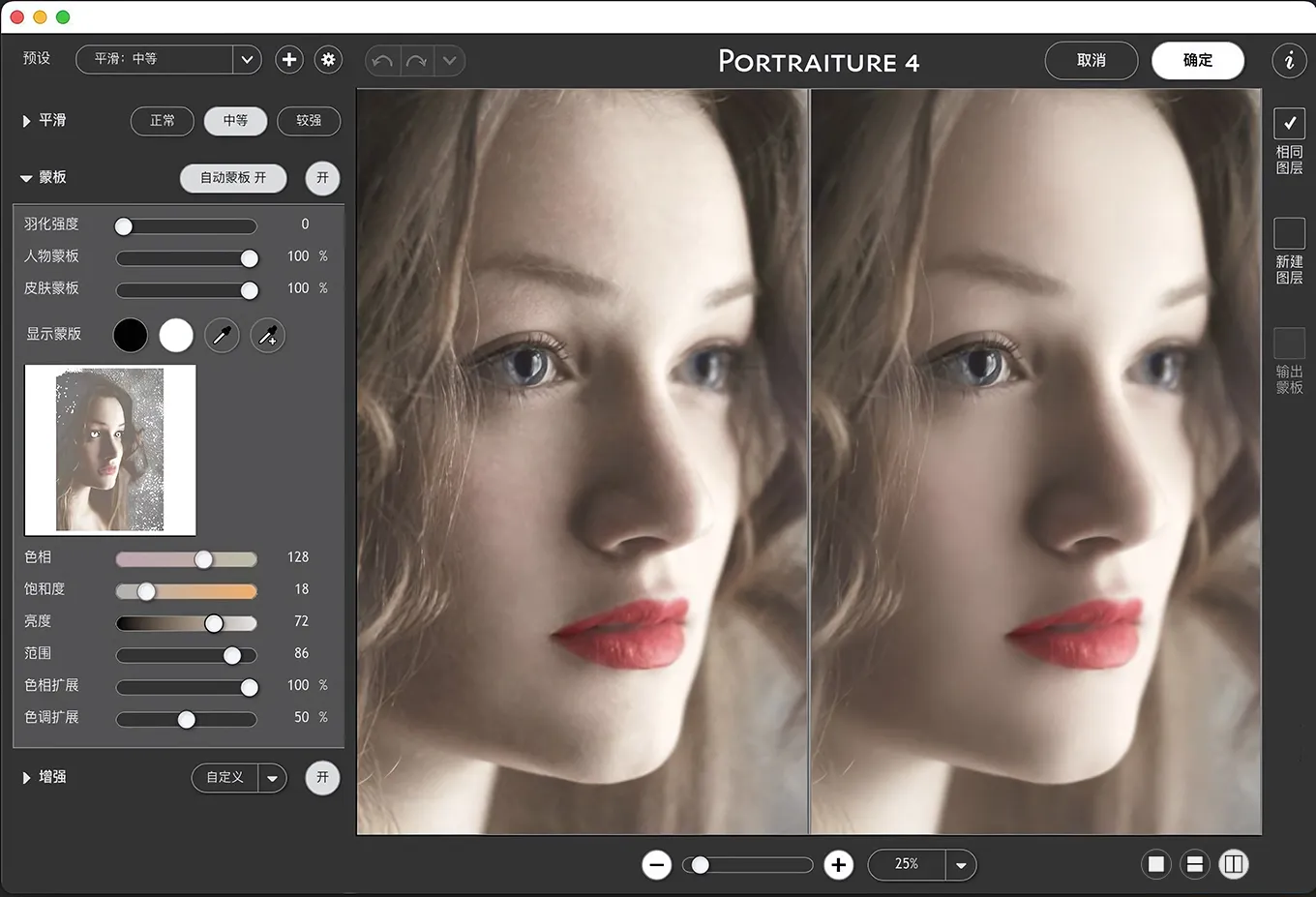 Portraiture具有强大的蒙板工具,仅在图像的肤色区域中进行选择性平滑。