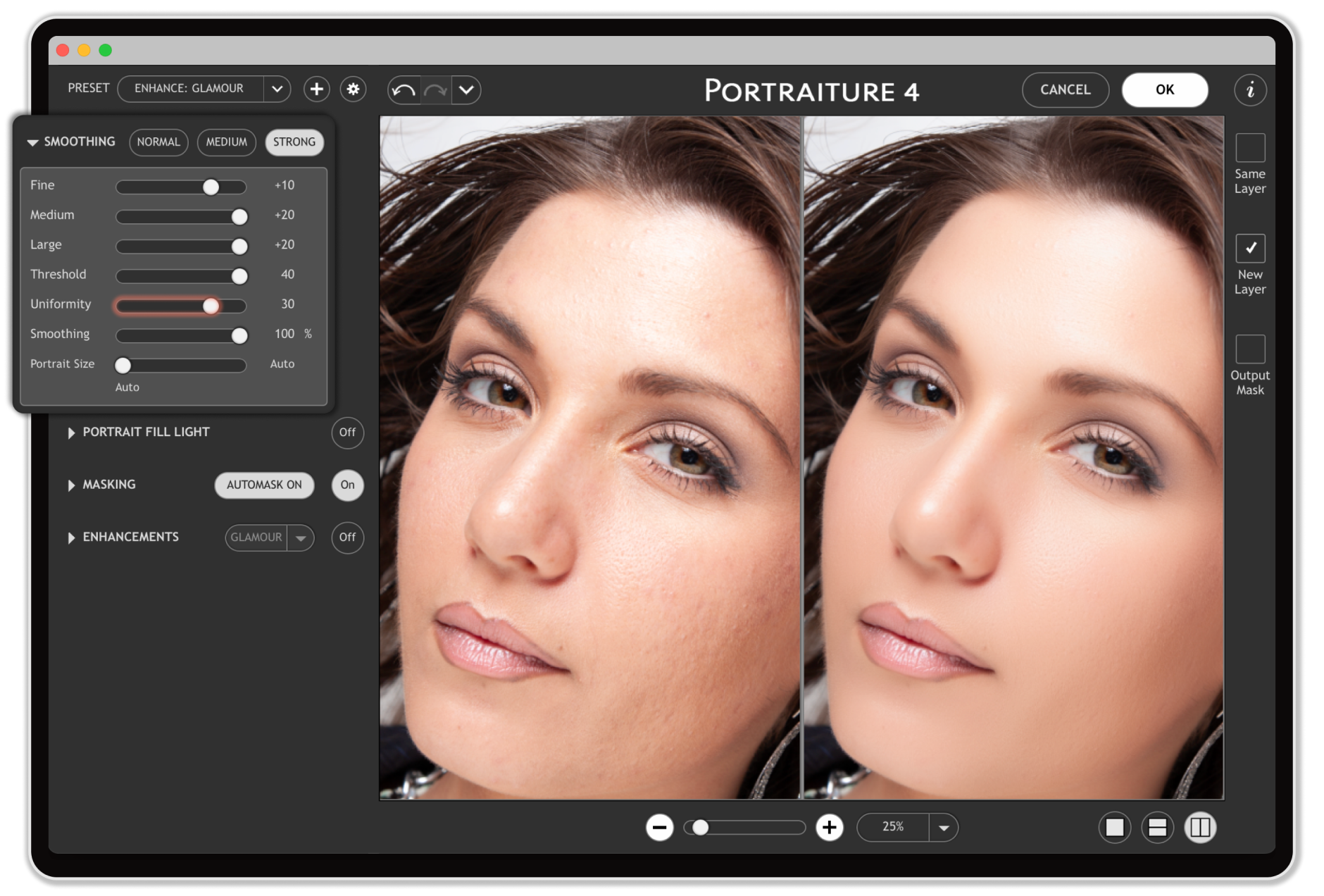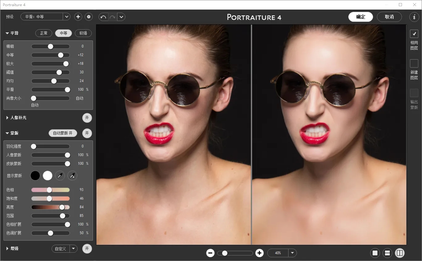 Portraiture具有强大的蒙板工具,仅在图像的肤色区域中进行选择性平滑。