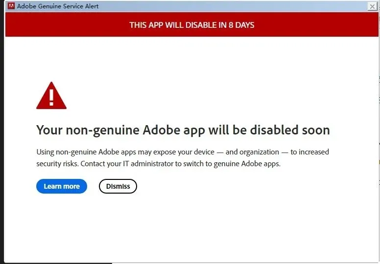 有不少粉丝在使用Adobe软件过程中遇到了正版弹窗提示:Your non-genuine Adobe app will be disabled soon,下面介绍两种解决方法。