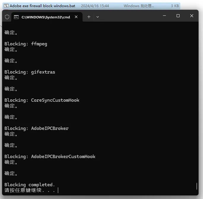 1、直接使用提供的Adobe弹窗专用防火墙规则批处理文件Adobe exe firewall block windows.bat(见下载),管理员身份运行打开,就会自动运行,将Adobe相关程序添加到防火墙禁止联网。