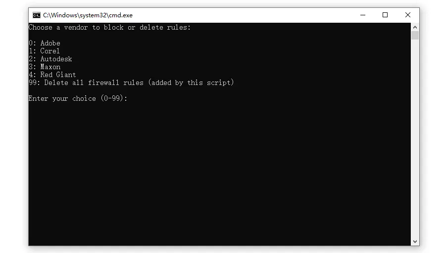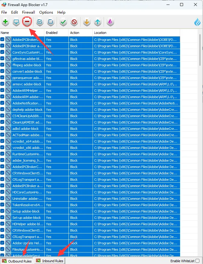 2、另外也可以用🔥WinMasterBlocker(非常适合新手,下载压缩包内含)一体化防火墙控制脚本,它是一款基于Windows防火墙开发的批量拦截工具,一键阻断Adobe全家桶联网,避免手动低效操作,同时也能规避失误。WinMasterBlocker不仅能阻止 Adobe全家桶软件访问您的网络!还可以阻止Corel、Autodesk、Maxon、Red Giant 等软件访问您的网络!