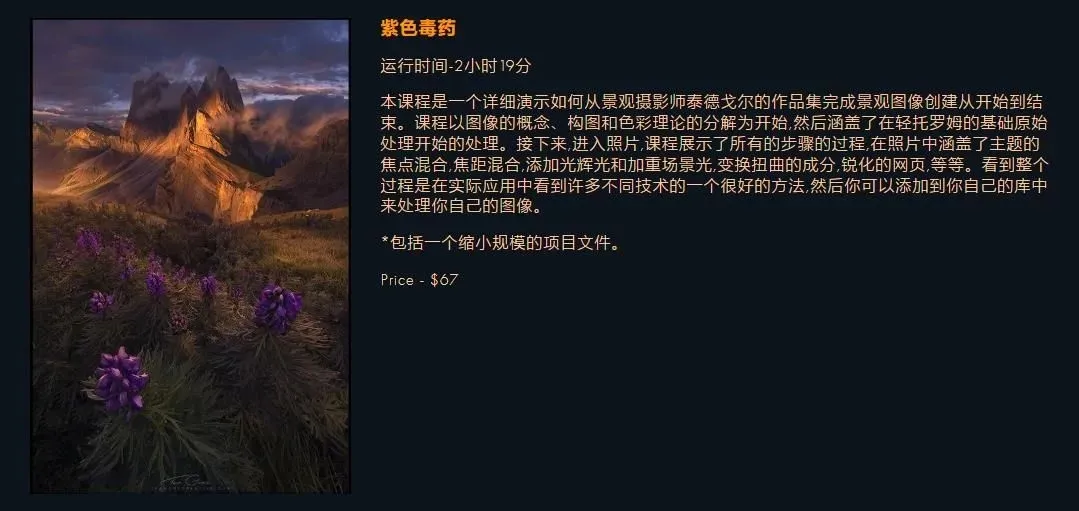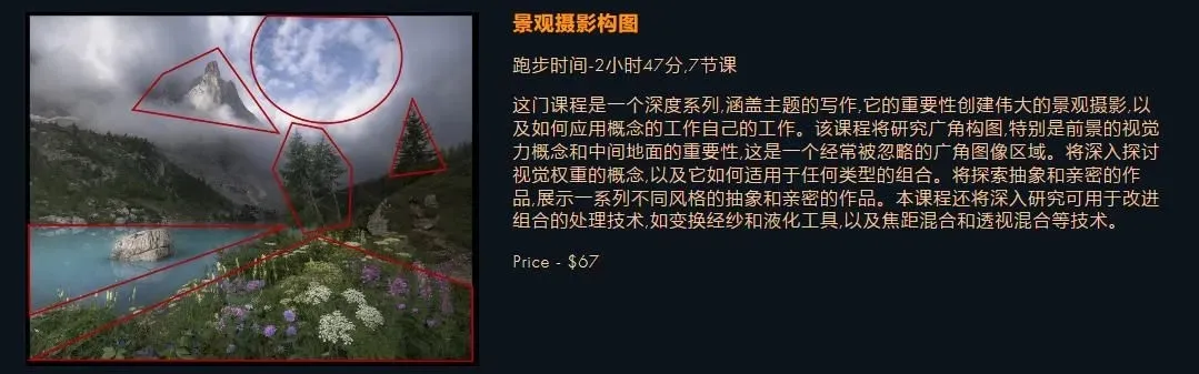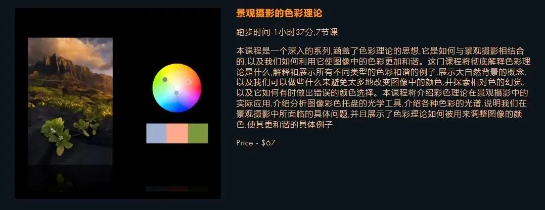 本课程是一个深度系列,涵盖色彩理论的概念以及它与风景摄影的关系,以及我们如何使用它来使图像中的色彩更好,更和谐。本课程将彻底解释什么是色彩理论,讲解并显示所有不同类型的色彩和谐的例子,介绍自然背景的思想以及我们如何避免过多改变图像中的色彩,并探索相对颜色的错觉以及它有时可能如何诱使我们做出错误的颜色选择。本课程还将介绍颜色理论在风景摄影中的实际应用,方法是介绍用于分析图像调色板的Adobe色彩工具,遍历光谱的每种颜色,并说明使用这些颜色的风景摄影所面临的特定问题,