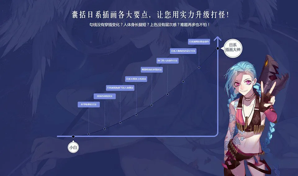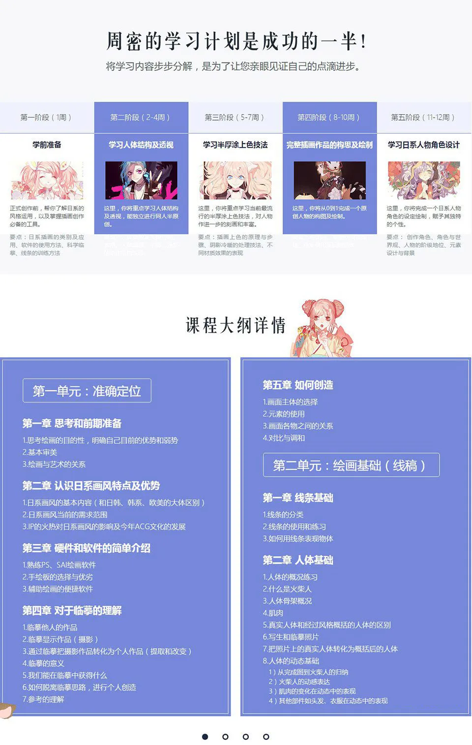 课程周期共3个月,分5个学习阶段:软件应用及线条练习、人体结构与透视、半厚涂上色技法、完整插画作品的构思与绘制、日系人物角色设计,助你从0到1搞定日系插画的各大难题。