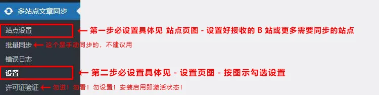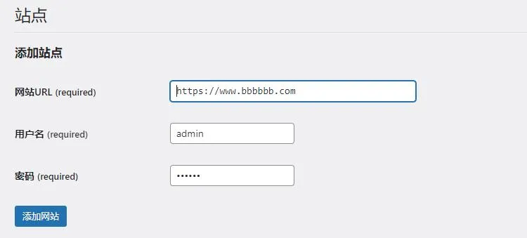 - 第四步(必设置):添加需要同步的站点(例如:把A站(发布站)的文章同步到B站(同步接受内容的站点),你在B站也要安装这个插件,但是,B站的插件只需要安装启用即可,不需要做任何设置),A站里在下面的第一行填写B站的网址,比如你的B站是https://www.bbbbbb.com,用户名和密码就是你的后台账户和密码(例如账户admin,密码123456)。填写完成后,点添加即可,如果你有多个网站,方法是一样的,在A站里可以添加多个。【特别说明:(A站)发布站和(B站)接收内容的所有站点都需要安装本插件的,(B站)接收内容的站点只需要安装启用即可,(A站)发布站是需要设置填写接收内容的所有站点的域名账户密码!本帖所有图示都是(A站)的设置】