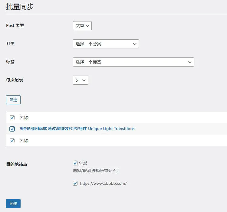 - 第五步(这个是手动同步的可以不看):手动批量同步,按我下面这样设置,看你每次需要同步多少文章,选择好之后,先点搜索,然后,勾选你要同步的目的地,最后点同步,数据一会就同步过去了。