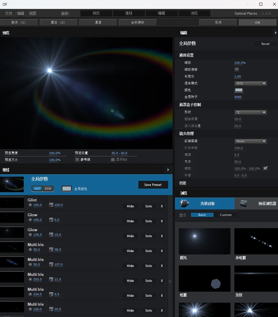 Optical Flares 功能强大,操作方便,效果绚丽,渲染速度迅速,备受大家的喜爱, 插件可以制作设计动画效果逼真的镜头耀斑灯光特效,拥有完整的独立界面,提供多种预设,可直接在插件中使用。