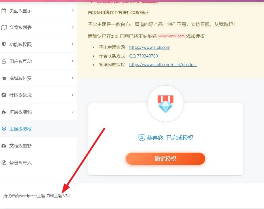 - 启用子比8.X主题,进入主题设置界面,立即授权,授权成功,等3秒页面自动刷新,点右上角保存。