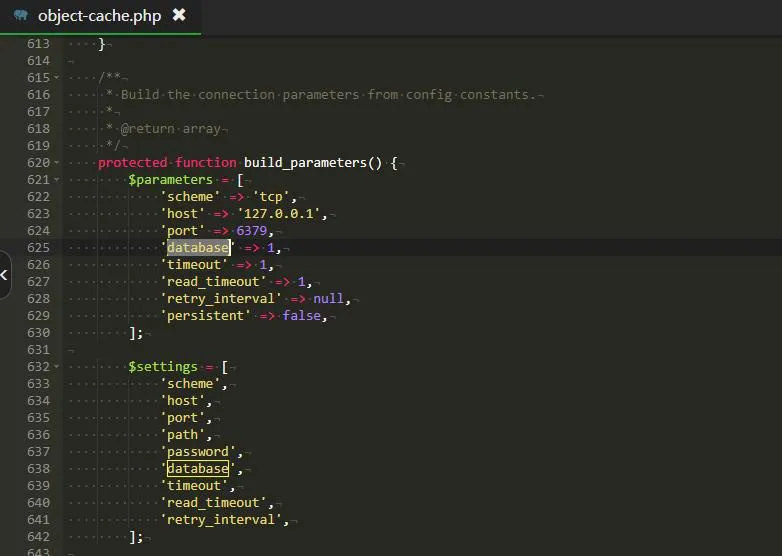 二、打开object-cache.php配置文件后,搜索:database,大概在第625行,把“0”改成1-15的任意数。