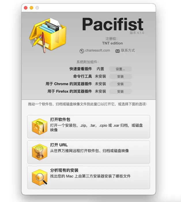 Pacifist 是一款功能强大专业的 Mac OS X .pkg解包工具,除了可以提取pkg中的文件外,还支持.dmg磁盘映像以及 .zip、.tar、.tar.gz、.tar.bz2、.xar存档的查看及提取文件。在安装之前,Pacifist还可以验证现有安装并查找丢失或更改的文件*,并且Pacifist还可以检查系统中安装的内核扩展,以查看安装了哪些安装程序以及该安装程序是由Apple还是第三方制作的。