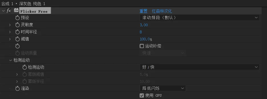 由于我们肉眼和摄像几捕捉的光线频率不一样,所以我们有时候用摄像机捕捉的视频会出现光闪烁的现象。Flicker Free插件能就能帮助我们弥补这一缺陷,能够很好的处理光闪烁的现象:光闪烁,延时拍摄闪烁,动态闪烁等。解决做延时摄影或拍摄慢动作(高帧速率)视频产生的闪光。同时这也是非常有效的去除LED灯,电脑显示器或当有电气干扰时产生的闪烁。插件从分析画面的颜色和亮度从而计算匹配出平滑的视频图像。支持4K, 支持GUP加速渲染。