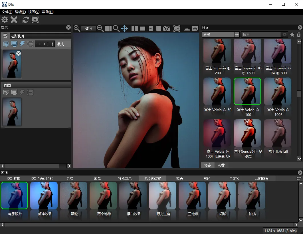 - 胶片实验室包含:电影胶片、反冲胶片、颗粒、两个地带、漂白效果、曝光过度、三地带、闪烁、油渍等滤镜效果。
