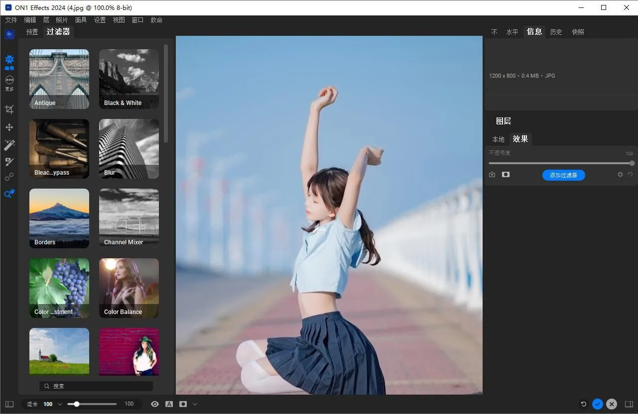 此外,在ON1 Effects 2024 中你还可以对其进行任意组合、融合及自定义样式,从而让用户能够更加智能化的进行照片处理,而且这种方法对于用户而言非常简单,只需用户将图片拖拽至操作简单,然后根据自己的喜好添加滤镜即可。另外相比之前的版本,在2024 版本中ON1公司对RAW处理引擎进行了大幅度升级优化,同时还加入了全新的HDR功能和全景照片合成功能,以及对照片选区部分和背景部分进行了精确的调整。