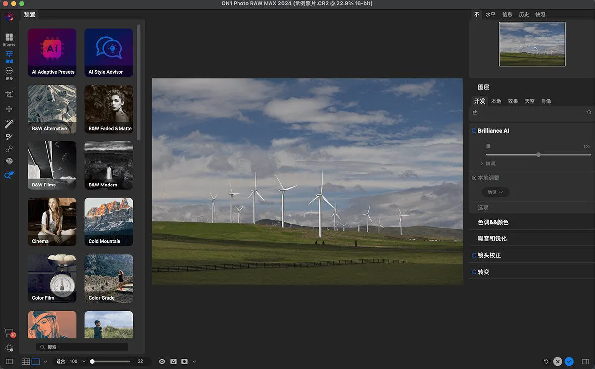 体验全新的 ON1 Photo RAW MAX 2024,具有强大的 AI 增强功能、改进的速度和性能以及简化的用户界面,可实现更高效的编辑。改变游戏规则的新技术 Brilliance AI 通过将颜色和色调调整与场景识别相结合来智能地增强照片。它会自动增强天空、水和树叶等元素,从而提升您的图像。增强的用户界面确保照片管理和编辑之间的无缝过渡,具有 AI 推荐的预设、100 多个新预设、自动应用降噪和人像修饰等等。