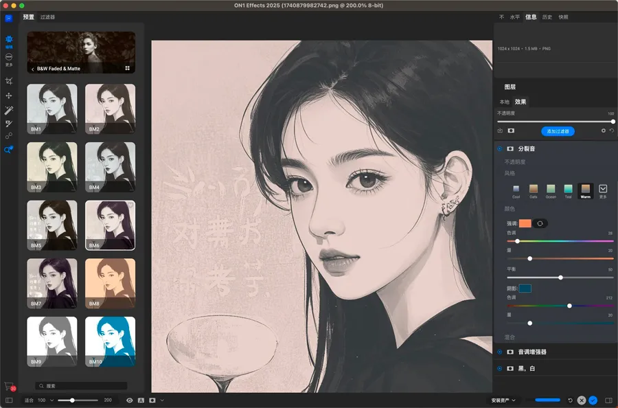 ON1 Effects 2025 是由ON1公司推出的一款功能强大的照片滤镜调色软件,该软件采用最新的一代的RAW档高速处理引擎,可以完美兼容目前主流计算机架构,并且软件内置一个超大特效滤镜库,里面包含了各式各样的预设、滤镜、LUT、纹理、边框等,例如B&W、HDR外观、动态对比度、镜头模糊(倾斜移位)、发光、胶片外观、分割色调等,你知道的和不知道的这里全都有。