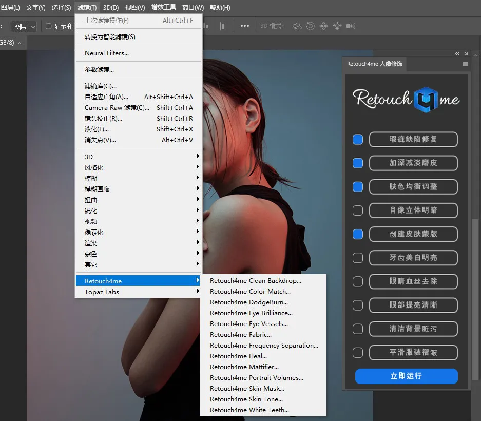大名鼎鼎的3D LUT CREATOR团队开发的AI智能人能磨皮美容软件Retouch4me系列,现在一共有十三款软件。这是一套基于神经网络的人像照片快速精修工具,它功能强大,内置了包括Portrait、Dodge Burn 、Clean Backdrop等十三个人像修饰插件,基本上涵盖了人像处理中的方方面面:光影、磨皮、去瑕疵、美白等效果一应俱全。同时它基于神经网络,使得操作简单易上手,是一套备受推崇的经典插件。在PS里还集成了扩展面板方便使用,共包含: