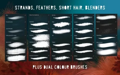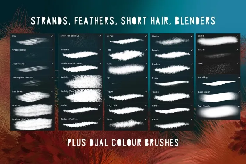 笔刷多种多样,有的可以产生光滑的毛皮效果,有的有卡通风格,有的有凯特双色,可以给你带来多种多样的效果。单独或组合在一起,您可以获得一些令人惊叹的效果,无论是现实的动物还是奇幻的艺术。它们对鸟类也很有效。