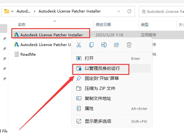 选择Autodesk License Patcher Installer鼠标右键以管理员身份运行