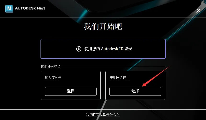 在电脑桌面找到Maya软件打开,选择使用网络许可。