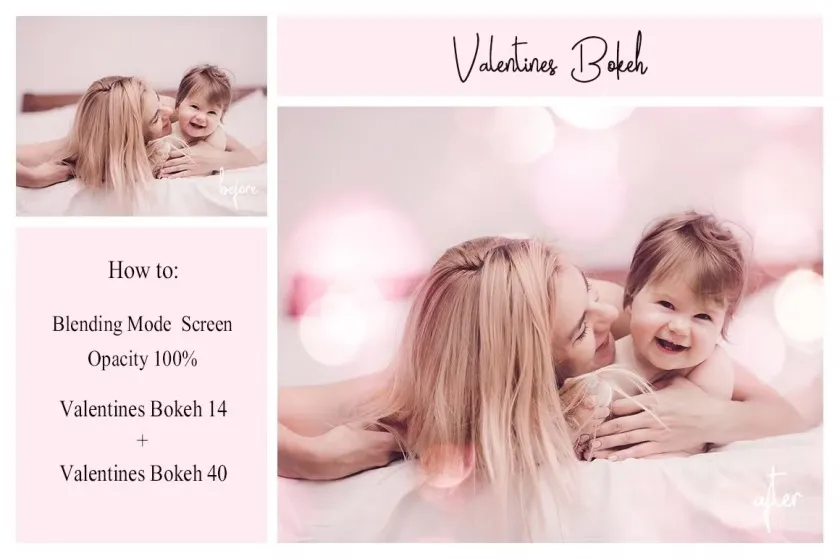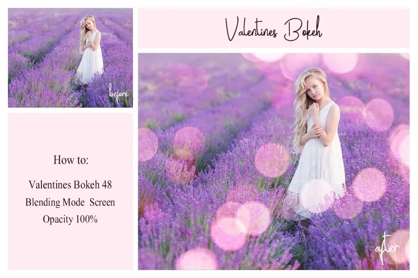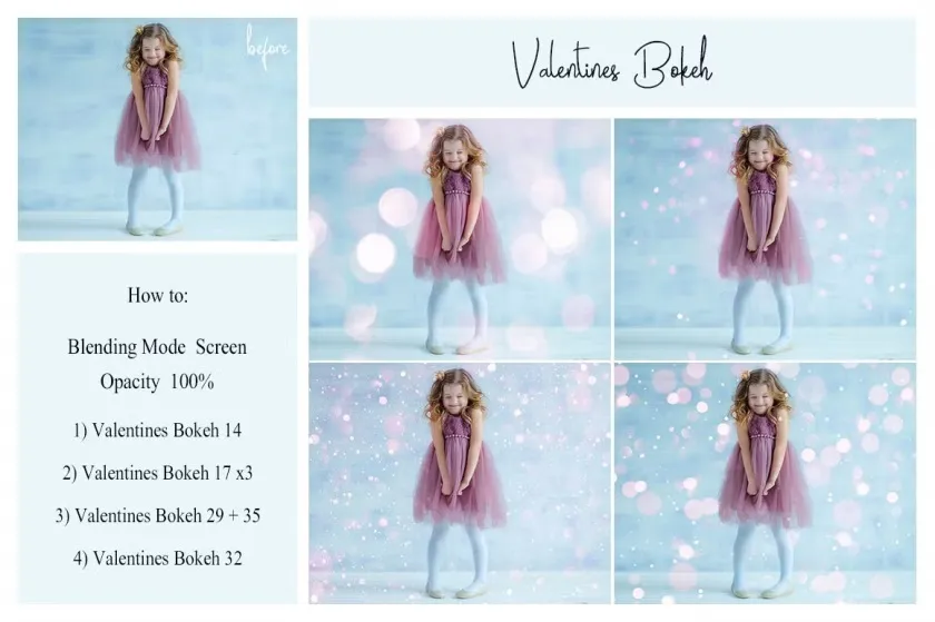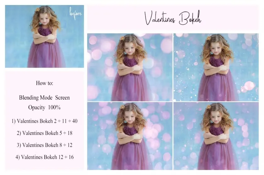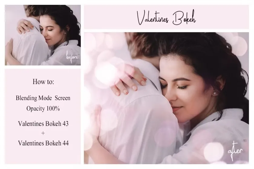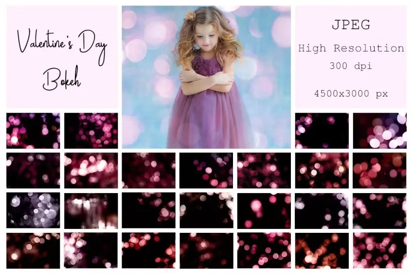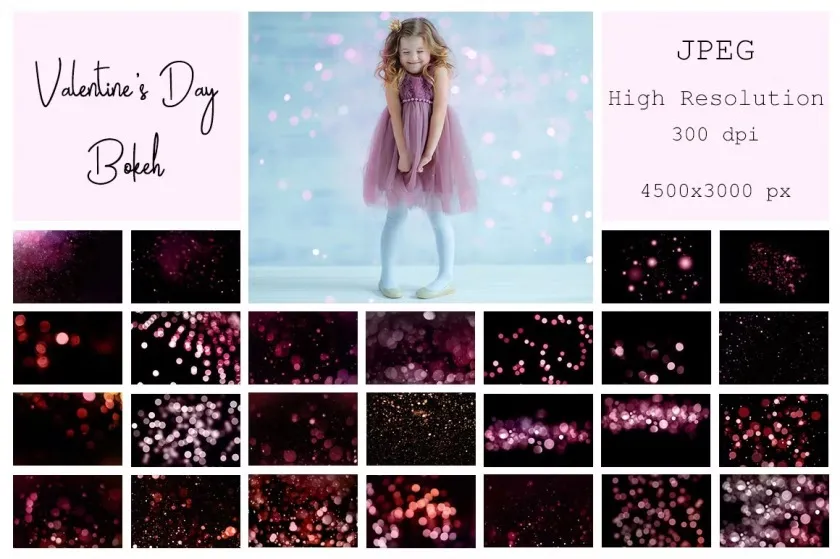 The collection of 50 different types of Valentine’s Day bokeh overlays.