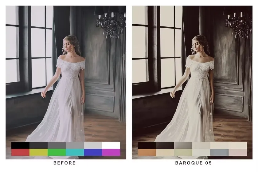 巴洛克风格 (10 个预设)- 这些 Lightroom 预设提供温暖的复古色彩、对比色调和棕褐色亮点。