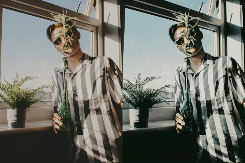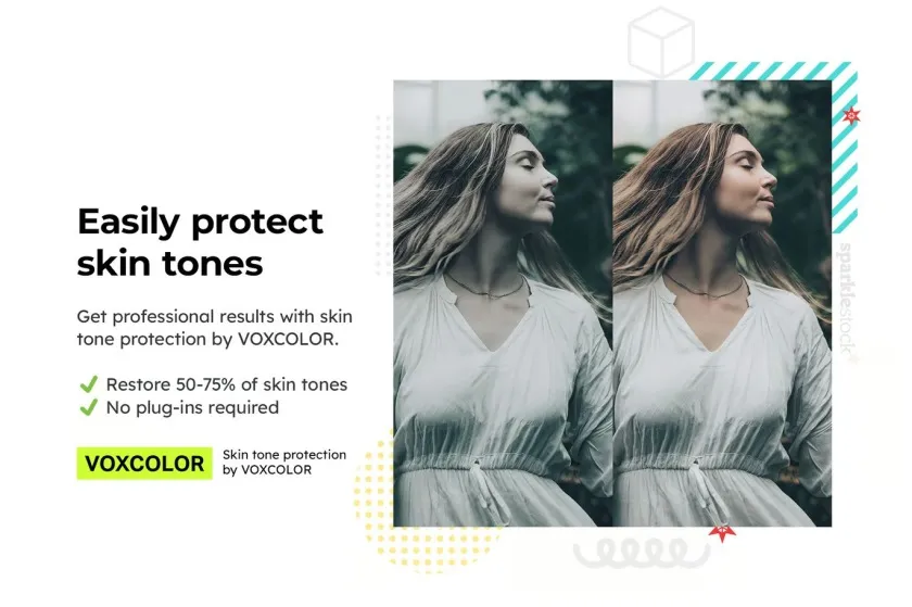 对于肖像,请使用皮肤保护预设。每个预设都带有单独的皮肤保护版本,该版本通过 VOXCOLOR 的肤色保护得到增强。该算法可恢复 50-75% 的原始肤色以获得专业效果。