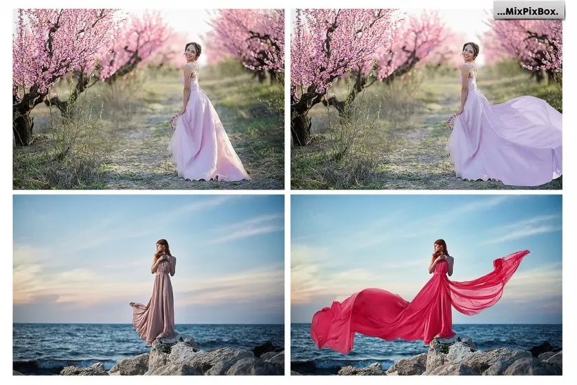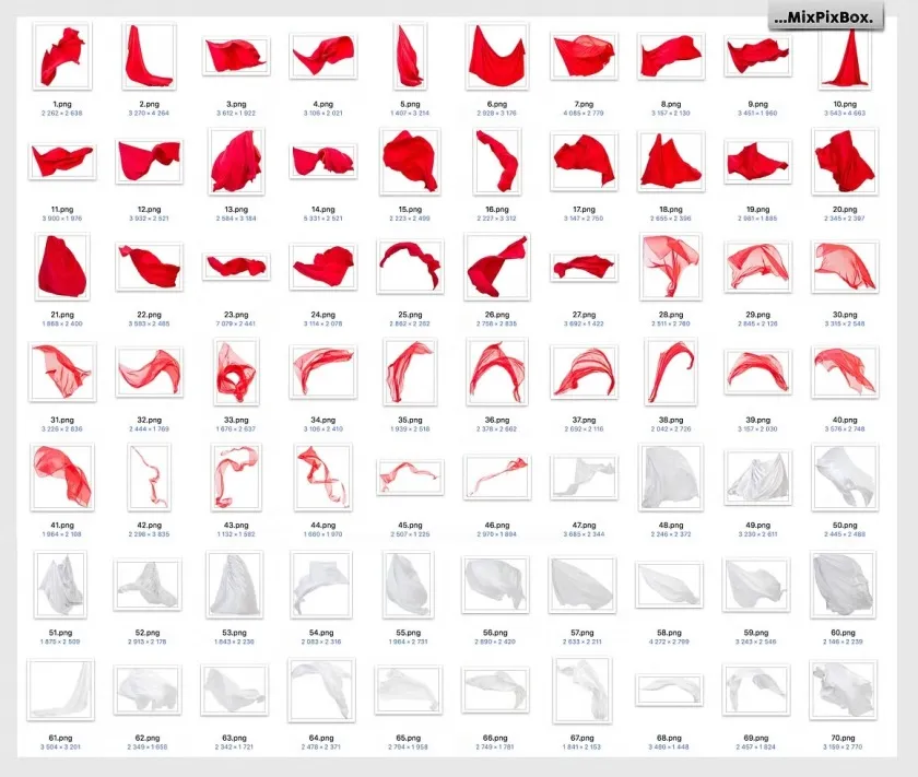 Immerse yourself in a floaty interplay of fabrics. Whether majestically sliding down, swinging in the wind or wildly gyrating – these 70 billowing textures in PNG format will allow you to decorate your designs with artful vibes. You can quickly find what your image demands: choose between turbulence and harmony, clearly recognizable structures and swirling mists, or between luminosity and restrained tint. Whatever you decide on – you will receive high-resolution and first-class quality anyway!
