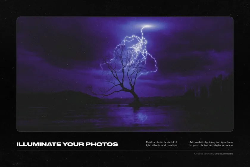 使用这款终极闪电和镜头光晕套装,让光线尽在您的掌控之中! 只需单击几下,您就可以为任何项目创建逼真的照明细节,并且您可以随时进行颜色调整、增加/减少不透明度、设置混合模式以及调整外发光滑块以适合个别照片和艺术品。
