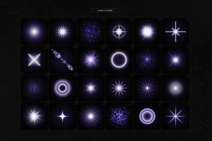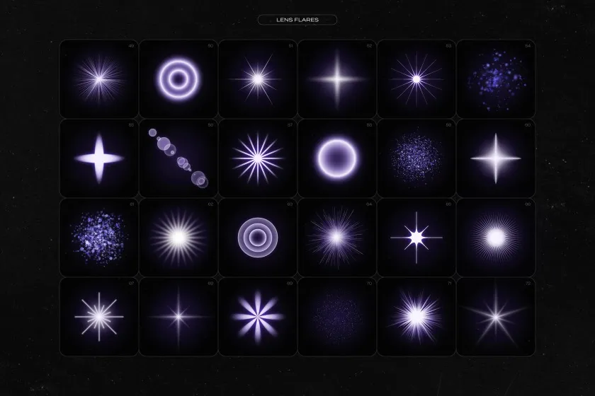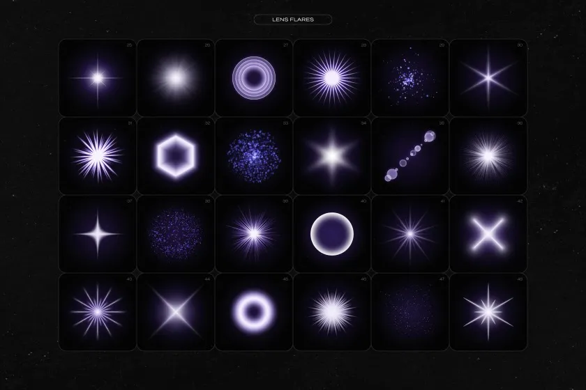 ABR 文件– 只需单击一下,即可为 Adobe Photoshop 和 Procreate 安装包含 72 个镜头光晕图章画笔的库。