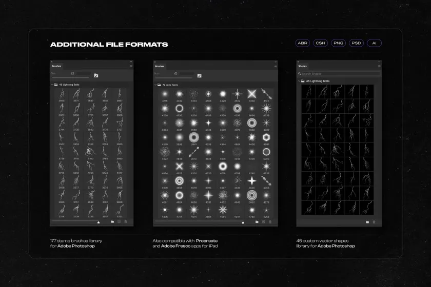 ABR 文件– 适用于 Adobe Photoshop 和 Procreate 的 45 个闪电图笔画笔库。