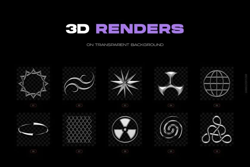 PSD 文件– 100 个高分辨率 5000×5000 像素 3D 渲染,具有组织良好的图层和高级颜色控制。