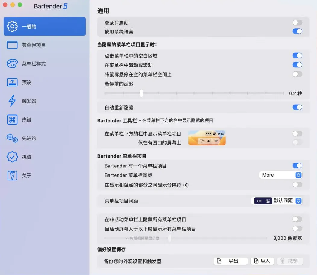 Bartender 5 for Mac 是一款专业的 Mac 菜单栏管理工具,可以帮助用户隐藏、组织和自定义 Mac 菜单栏中的图标和通知。使用 Bartender 5,用户可以将不常用的图标隐藏起来,使菜单栏保持整洁,并只显示重要的通知和信息。此外,Bartender 5 还支持自定义图标和通知的显示方式,让用户能够按照自己的喜好来设置菜单栏的外观和功能。
