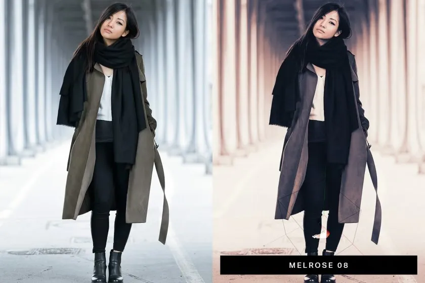10 个 Melrose 预设:哑光玫瑰金色调,带有一丝粉红色。