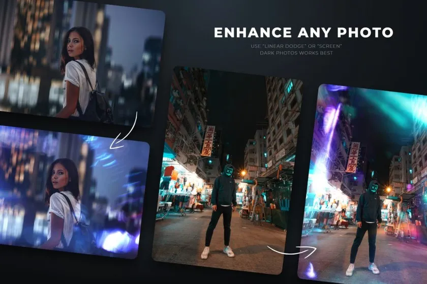 Neon Light Overlays V2 毫不费力地为您的照片添加深度!只需将我们的任何叠加层拖放到您的原始照片上方并更改混合模式即可。我们推荐“屏幕/滤色”或“线性减淡(添加)”模式,但这完全取决于您!