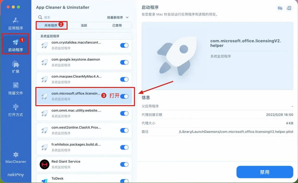 注意:如果激活完成运行还是未激活状态,检查一下是不是用比如 CleanMyMac X 之类的清理或者卸载工具禁用了 Office 的激活开机启动代理,名称为com.microsoft.office.licennsingV2.helper,如果禁用了,启用后重启电脑重新激活即可!