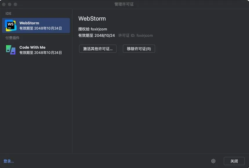 5、打开JetBrains软件,点击左下角的齿轮按钮,选择「管理许可证(Manage Licenses)」,然后选择「激活码(Activation code)」进入激活页面,将激活码复制到激活页面,点击「激活(Activave)」即可激活(已激活的可忽略此步骤)