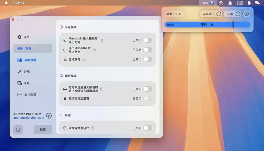 AlDente Pro是一款调节 macOS 充电量阈值的小工具,AlDente Pro可以限制最大充电百分比来保护电池的工具。锂离子和聚合物电池(如 MacBook 中的电池)在使用 20% 至 60% 的电池时使用寿命最长。始终将电池电量保持在 100% 会大大缩短 MacBook 的电池使用寿命,
