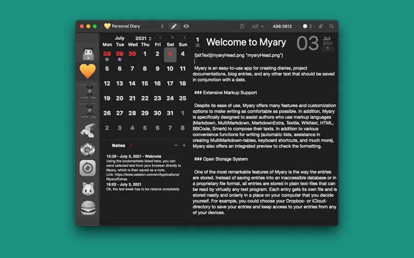 Myary是一款易于使用的应用程序,用于创建日记、项目文档、博客条目和任何其他需要在日期上下文中保存的文本。每个条目都存储在一个单独的文件中,您可以自由选择将条目保存到何处。
