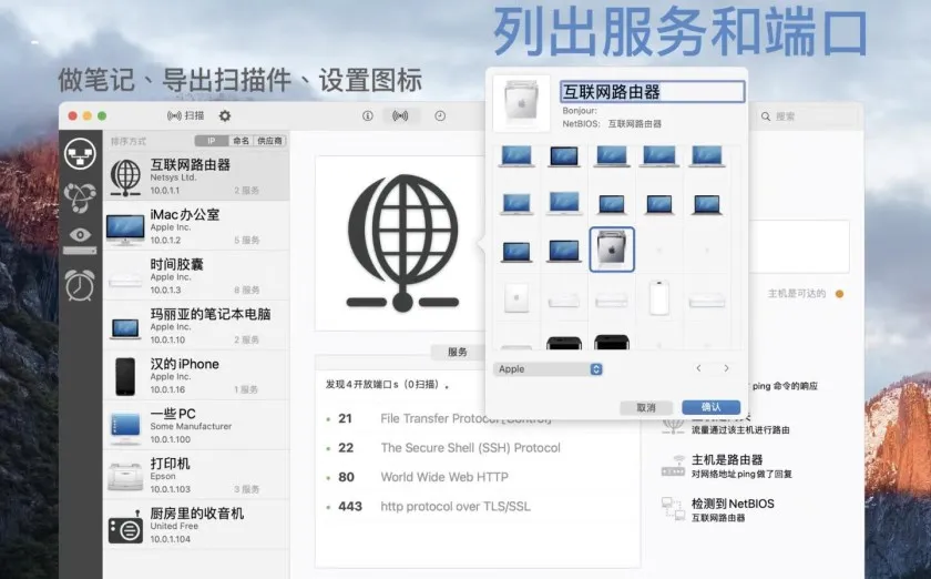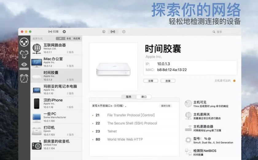 iNet Network Scanner 是Mac系统平台上的一款网络设备监控网络扫描软件,可以有效的了解安全风险,并保持网络的控制还在担心有人在不知情的情况下使用您的网络吗?哪些设备当前在线?哪些接入端口是开放的?提供哪些服务?你的路由器的IP是什么?iNet Network Scanner 可以远程唤醒睡眠设备。