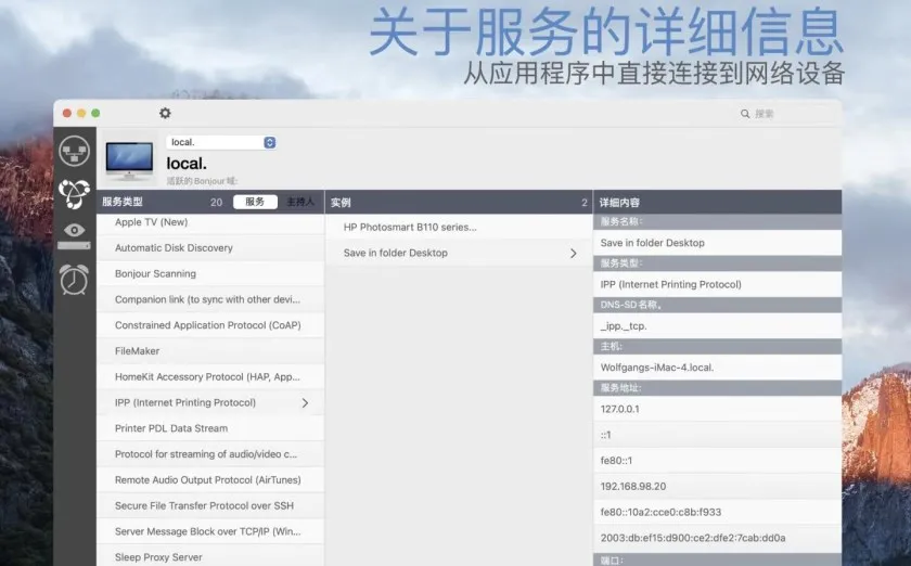iNet为您提供有关Mac连接到的网络和设备的信息。软件非常简单,界面设计使得用户体验非常友好,甚至允许经验丰富的用户深入了解网络,运行服务和Wi-Fi质量的概述。在当前版本中,提供以下功能:网络扫描仪,Bonjour监视器,Portscan用于标准端口,机场监控,蓝色唤醒,帮助部分。