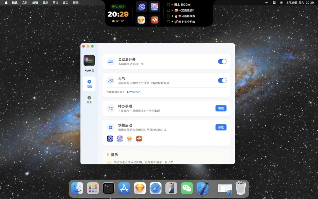 Nook X 是一款专为 macOS 设计的高效灵动交互效率岛小工具,它能在 Mac 上模拟刘海屏,展示多种个性化功能,比如歌曲歌词、日期、时间、天气温度显示、快捷启动、代办事项、AI智能对话DeepSeek AI 等功能,通过 Nook X,用户可以将刘海区域打造成一个小型信息中心,最大化屏幕空间利用率。Nook X 提供多样的自定义选项,让用户根据个人需求调整显示内容和样式,在提升桌面整理效率的同时完美融入桌面风格。