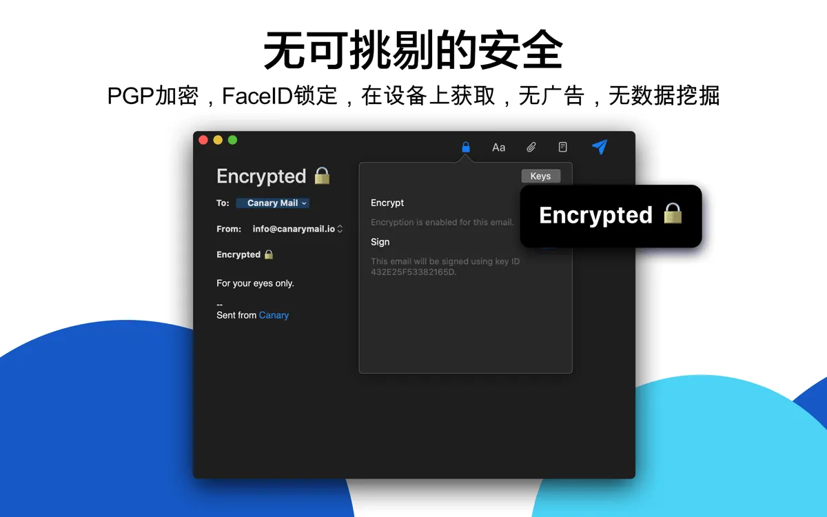 Canary Mail 是非常安全的,并提供PGP加密,开箱即用。为了简化密钥管理,它可以让你搜索你的Keybase接触,此外,将您的设备上的本地数据库进行加密,并没有个人数据(包括帐户凭据,访问令牌或电子邮件内容)存储在我们的服务器上。