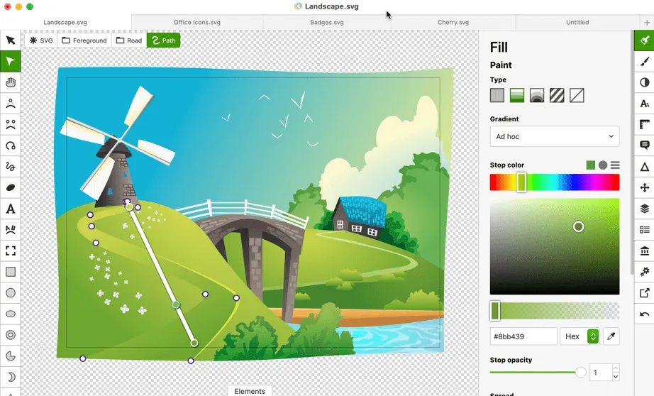- 清晰直观的用户界面深受Inkscape,Sketch和Adobe Illustrator的启发
