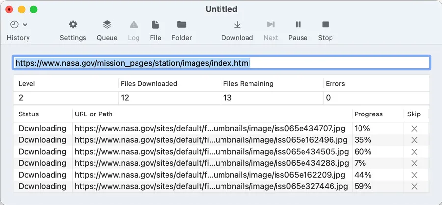 您可以将所有关于下载的信息保存在文档中。这允许您创建一个文档,您可以使用它随时执行相同的下载。如果在选择保存命令时SiteSucker正处于下载中,则SiteSucker将暂停下载并将其状态保存在文档中。稍后打开文档时,可以通过按“继续”按钮从停止的位置重新开始下载,非常方便!